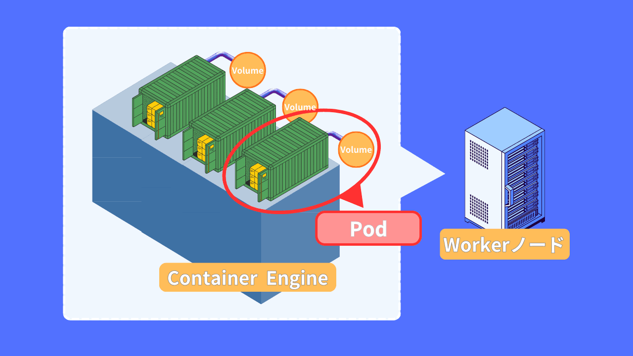 PodはKubernetes上でデプロイされる最小のデプロイ単位です。Podはコンテナとボリュームがセットになったものです。