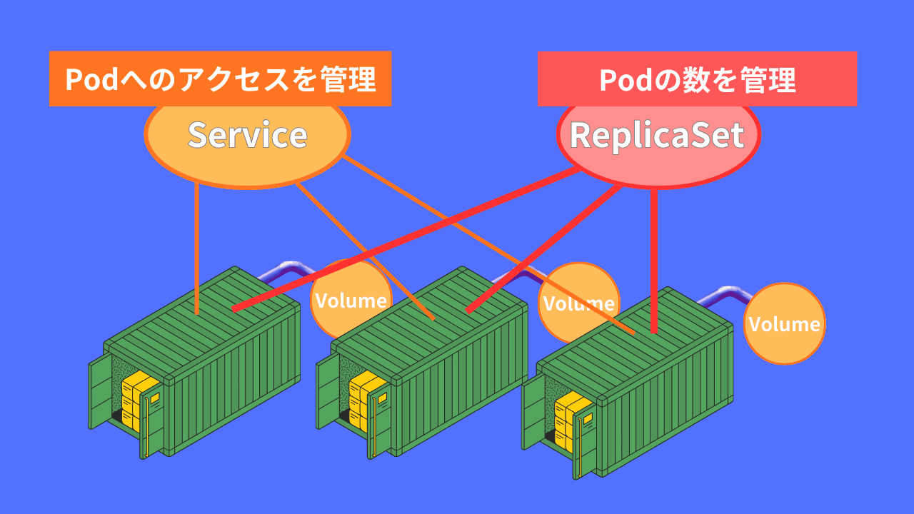 - レプリカセットは特定の数のPod (コンテナの実行単位)を維持します。