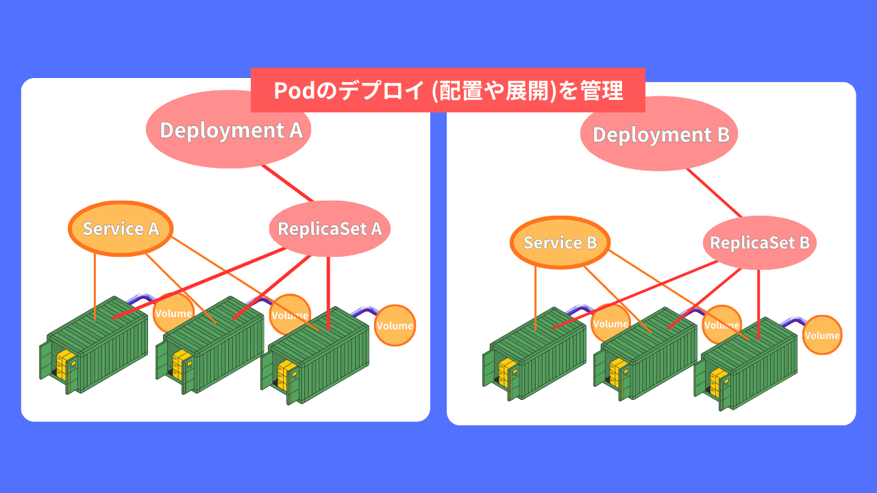 - デプロイメントはレプリカセットの一種で、レプリカセットを管理する高レベルなリソースです。