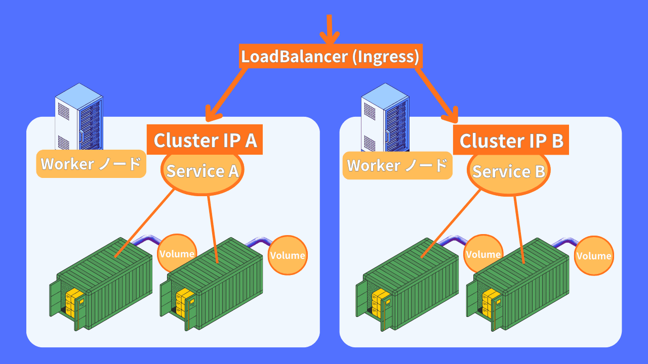 サービスのロードバランサーはあくまでWorkerノード内の話なので、各Workerノードへの振り分けは、本物のロードバランサーか、Ingress (イングレス)が行います。