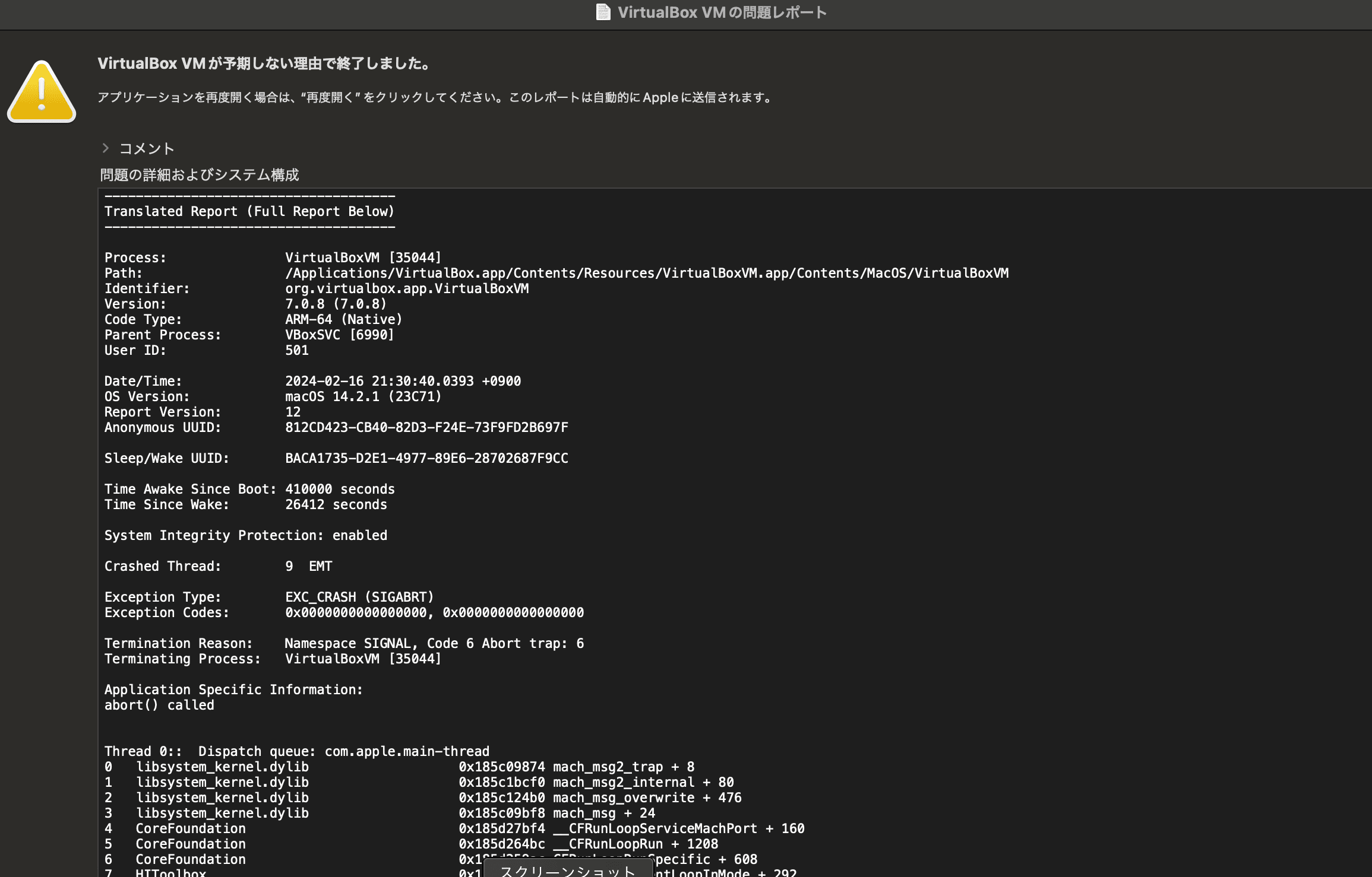 このエラーメッセージは、macOS上で動作していたVirtualBox VMアプリケーションがクラッシュした際に表示されます。色々と調べると、VirtualBox自体は動作しますが、現在M1 Macでは仮想マシンがうまく動作しないようです。
