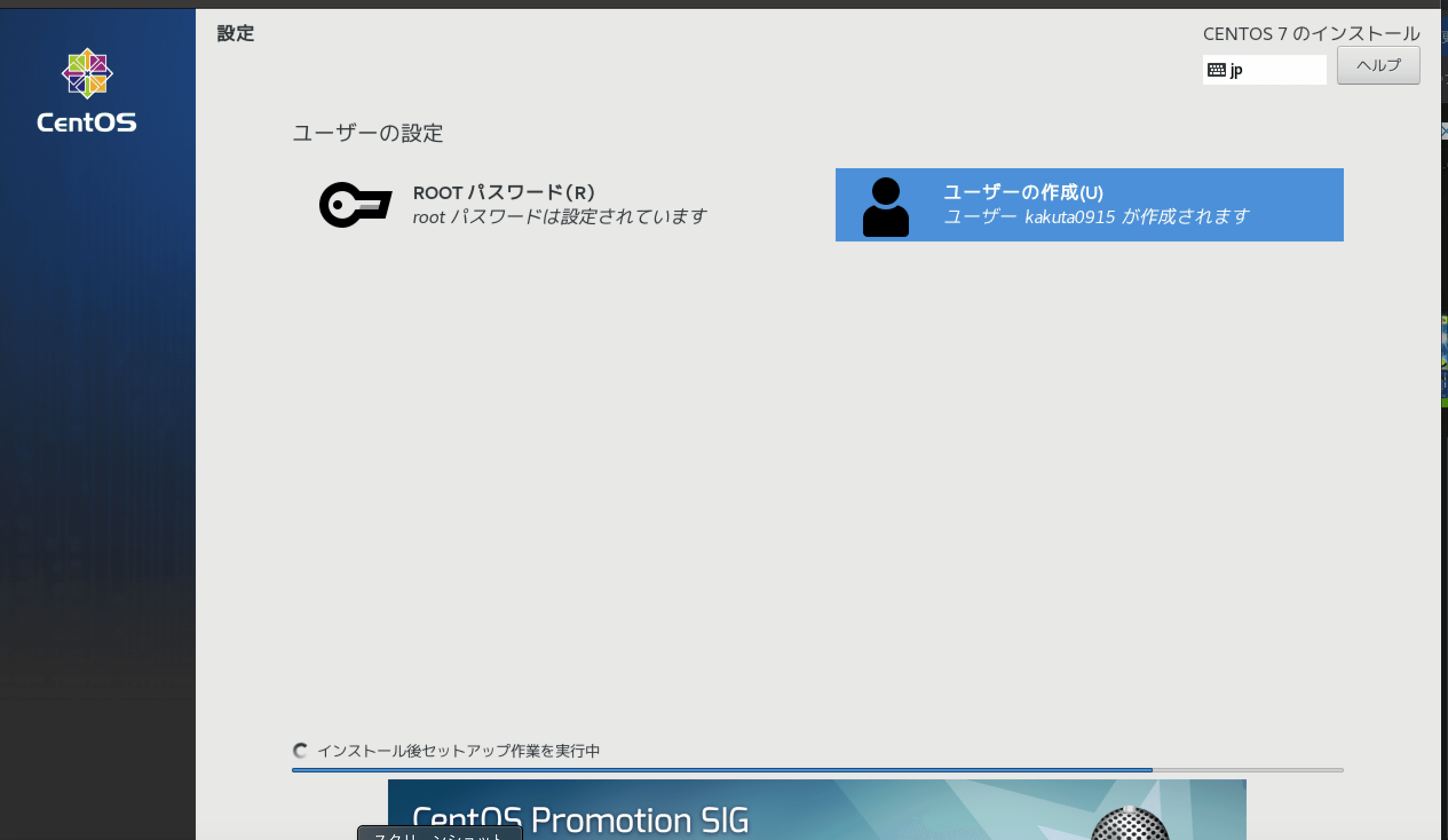 - インストール完了まで時間がかかるので、その間にROOTパスワードとユーザーアカウントを作成する