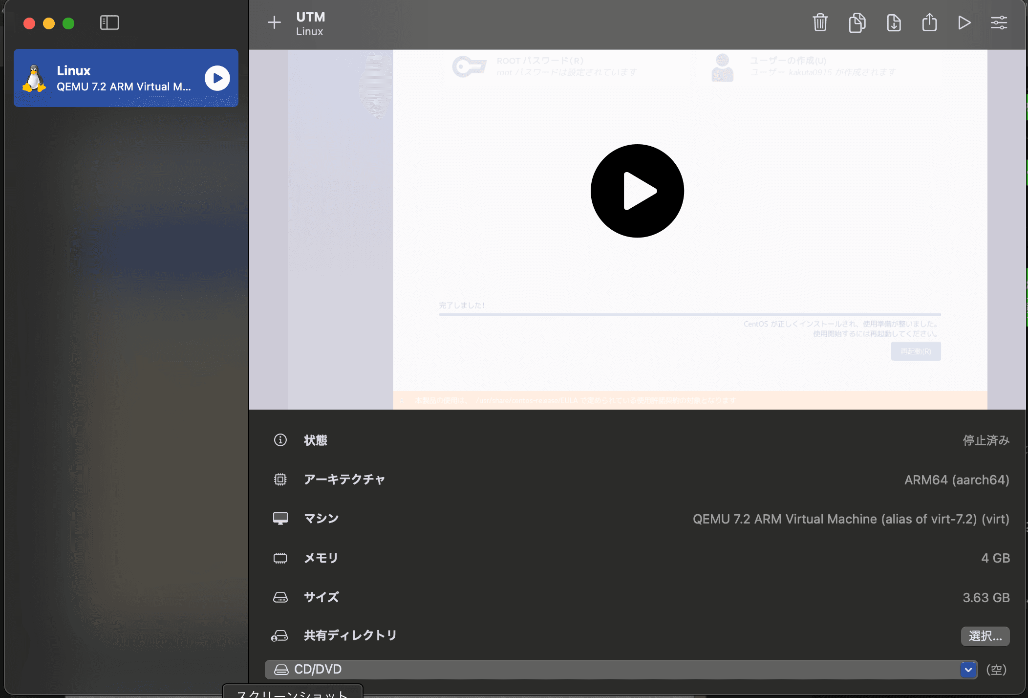 - 再度VMを起動し、CD/DVD項目で選択しているISOパスを削除する