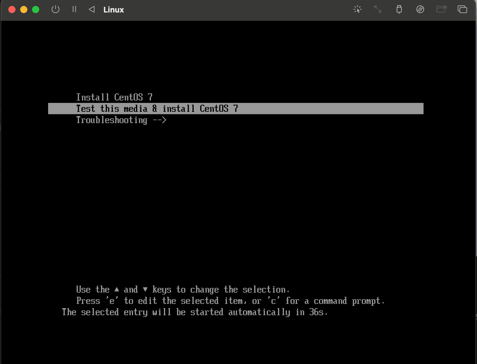 - VMを起動すると以下の画面になるので、「Test this media & install CentOS 7」を選択する