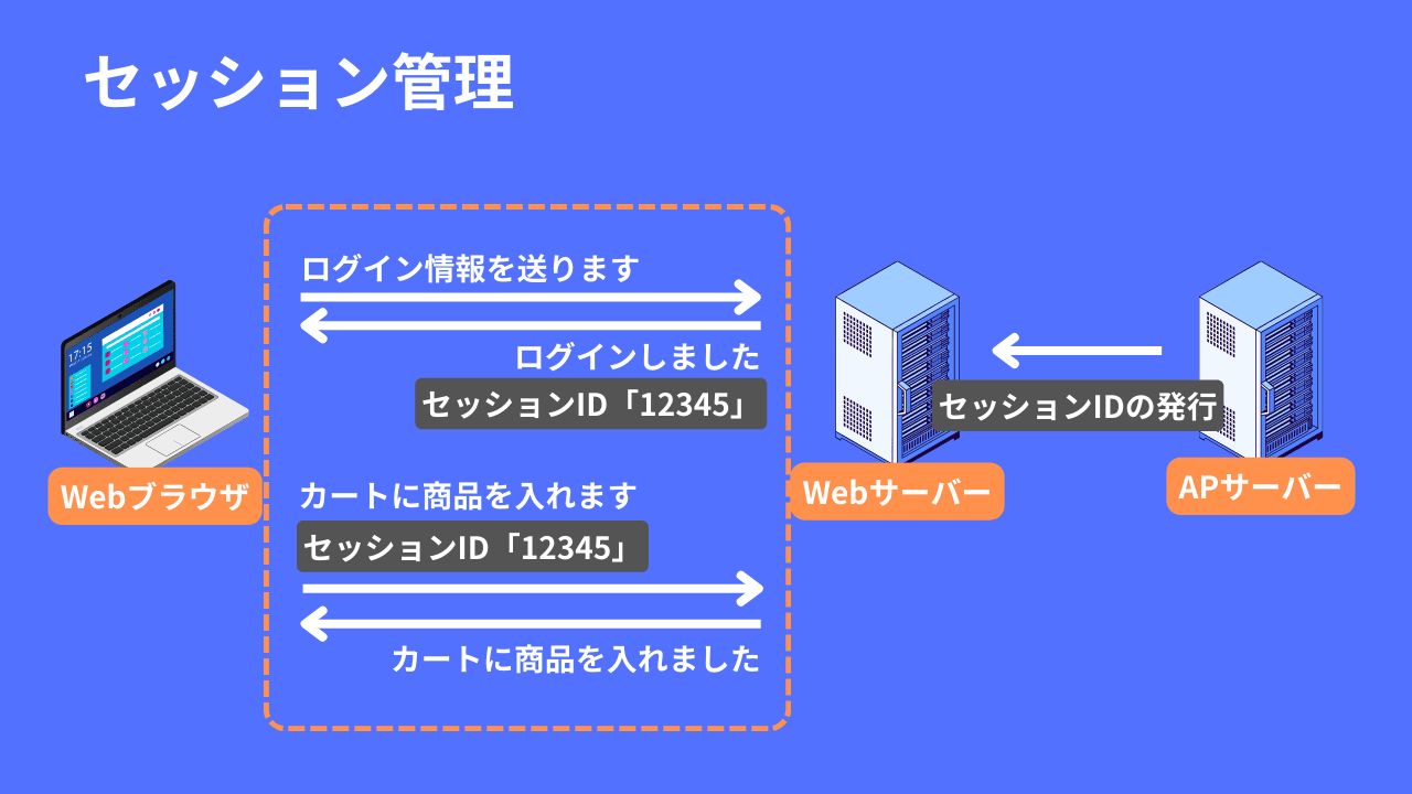HTTP通信は通常、ステートレスなプロコトルなため1回のやりとりで通信が切断されてしまい、状態を保持出来ません。APサーバーはクライアントごとに発行したID (セッションID) を通信データに含めることで、クライアントとの通信を1つの「セッション」として判別して、ログイン状態などを保持します。