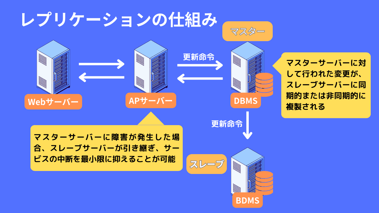 データベースレプリケーションでは通常、マスターサーバー (Master)と複数のスレーブサーバー (Slave) が関与します。マスターサーバーに対して行われた変更が、スレーブサーバーに同期的または非同期的に複製されます。