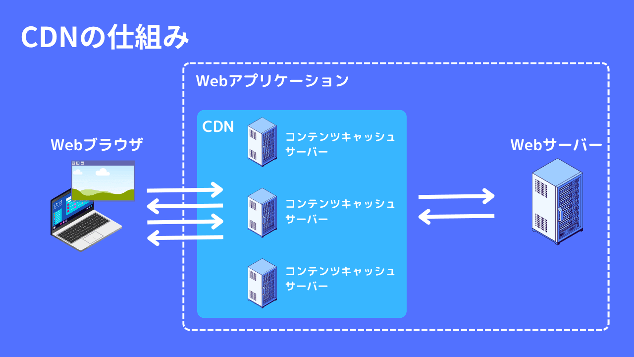 CDNは静的なコンテンツ (画像、CSS、JavaScriptなど) をキャッシュし、ユーザーからのリクエストに対してオリジンサーバー (ウェブサイトの本来のサーバー) にアクセスする代わりに、キャッシュされたコンテンツを提供します。これにより、ウェブページの読み込み速度が向上します。
