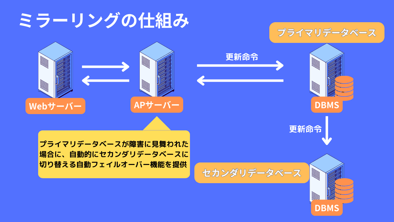 ミラーリングでは、通常、プライマリデータベース(マスター)とセカンダリデータベース(ミラー)の間で同期的なデータ複製が行われます。プライマリデータベースへの変更が発生すると、これがセカンダリデータベースにも反映されます。