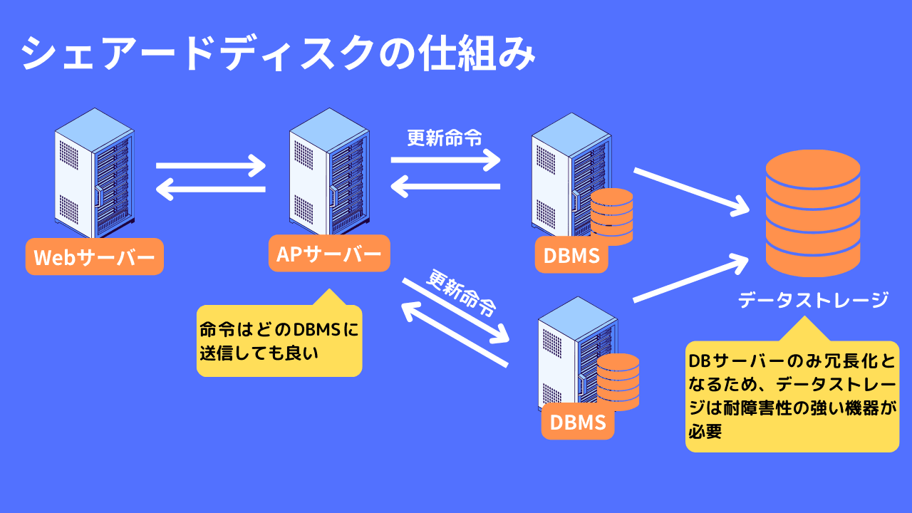 シェアードディスクは、複数のサーバーが同じデータを共有できる領域を提供します。これにより、データベースの情報が複数の場所に同じように保持されます。