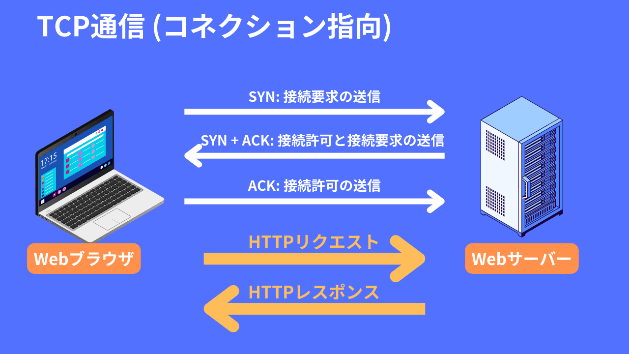 コネクション指向プロトコルとは、通信を始める前に「コネクション (接続) 」を確立し、その接続を通じてデータをやり取りする仕組みです。TCPは、まさにこのコネクション指向のプロトコルです。