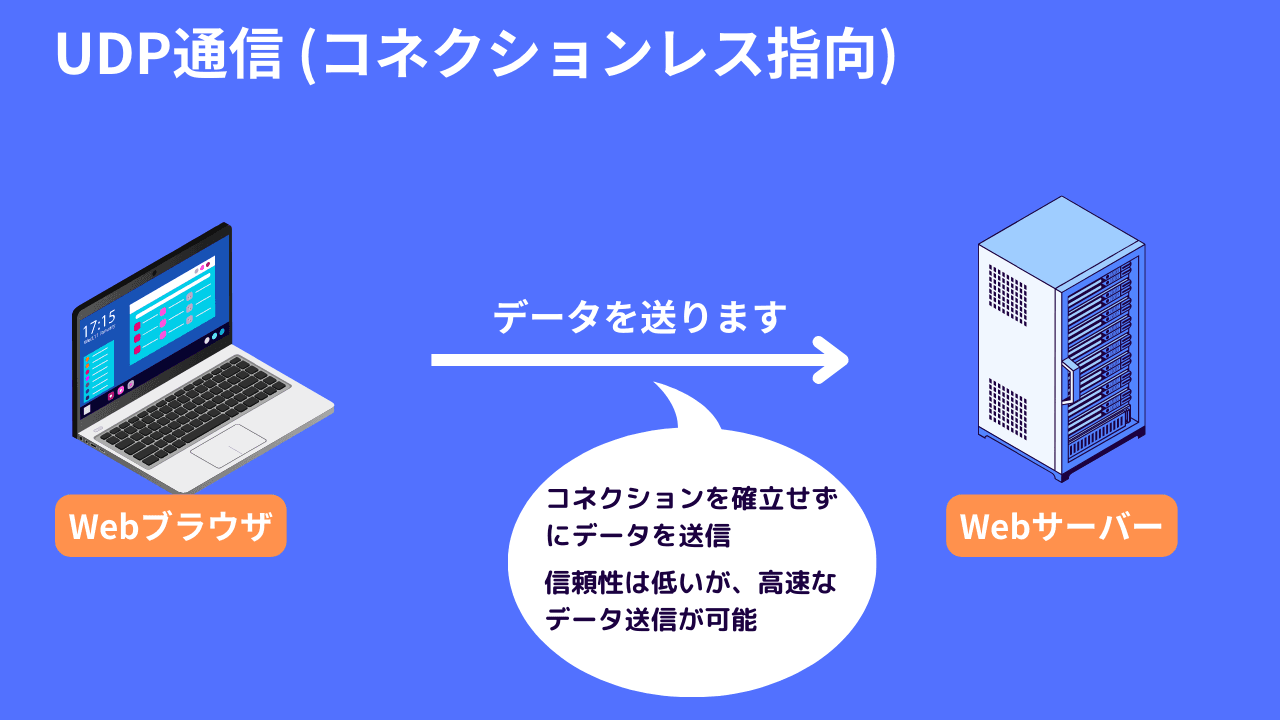 コネクションレスプロトコルとは、データを送る前に接続を確立することなく、すぐにデータを送信する仕組みです。UDP (User Datagram Protocol) は、このコネクションレスプロトコルの代表的な例です。