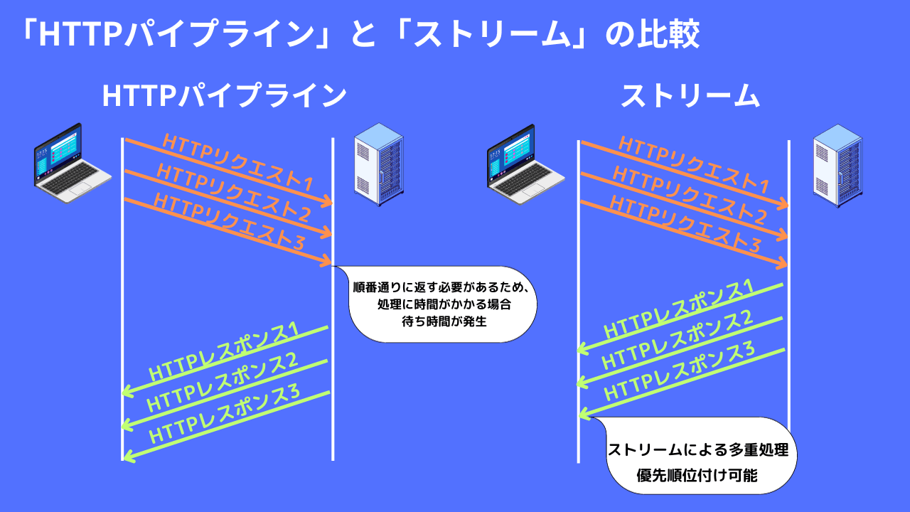HTTPパイプラインとストリームは、どちらも複数リクエストを送信できることに変わりありません。しかし、HTTPパイプラインは順番通りにレスポンスする制約があるため、処理に時間がかかった際に待ち時間が発生します。