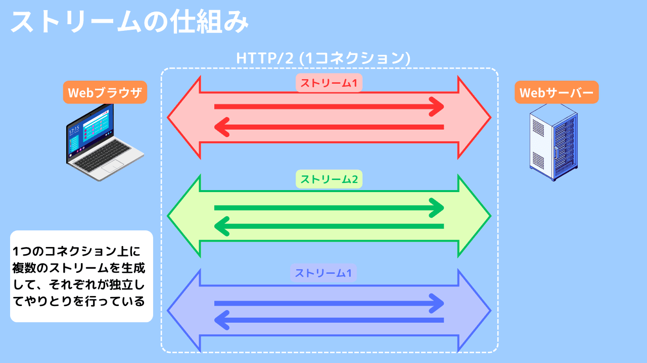 HTTP/2では、従来のHTTP/1.xの制約を克服するために「ストリーム」という概念が導入されました。これにより、1つのTCP接続上で複数のリクエストとレスポンスを同時に処理できるようになり、通信の効率性が大幅に向上しました。