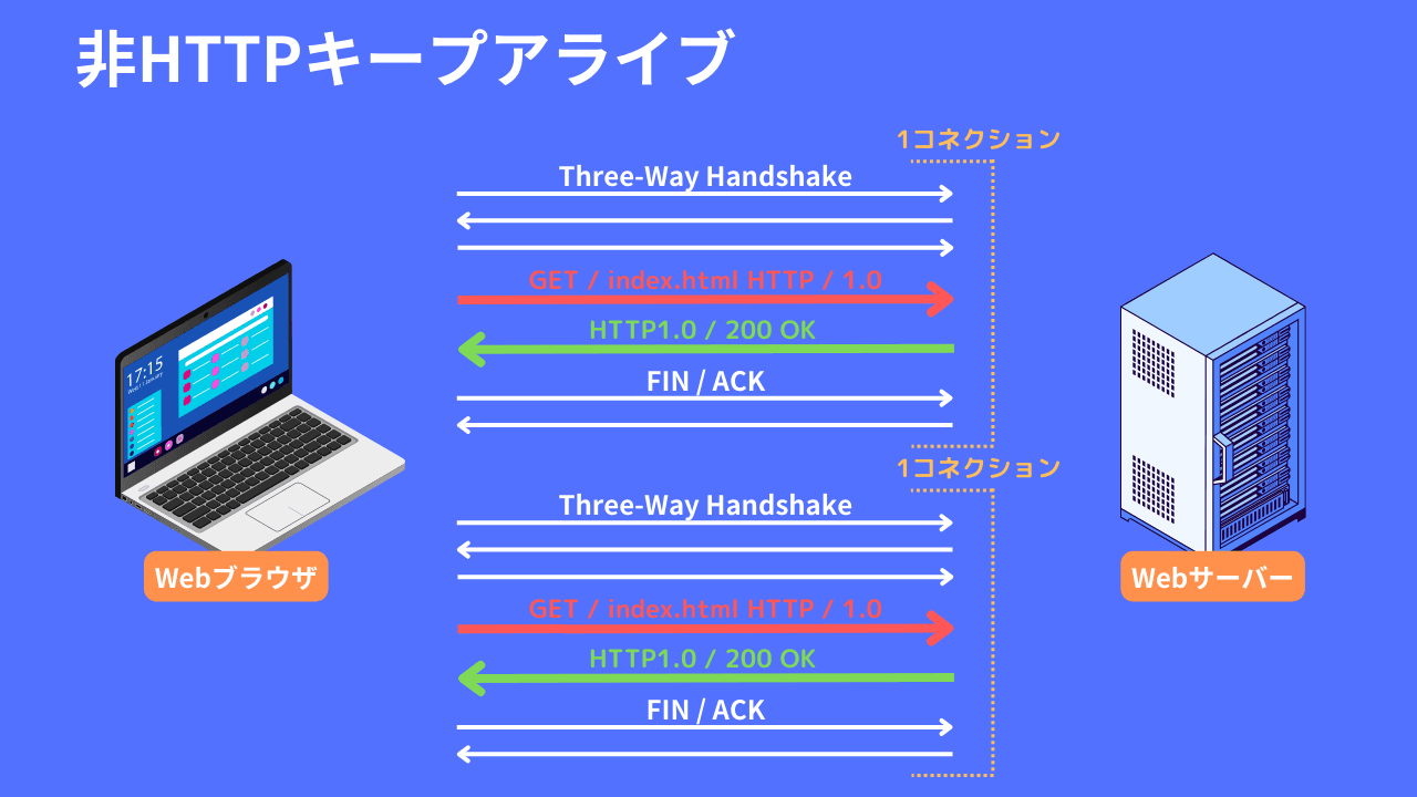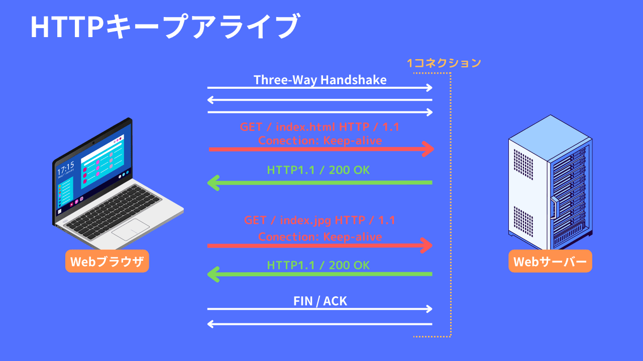 HTTPキープアライブ (HTTP Keep-Alive) は、HTTPプロトコルにおいて、単一のTCP接続を使用して複数のHTTPリクエストおよびレスポンスをやり取りする仕組みを指します。通常、クライアントがサーバーにリクエストを送信し、サーバーがレスポンスを返すと、接続が閉じられます。しかし、HTTPキープアライブを使用すると、同一のTCP接続を再利用して複数のリクエストやレスポンスを行うことができます。